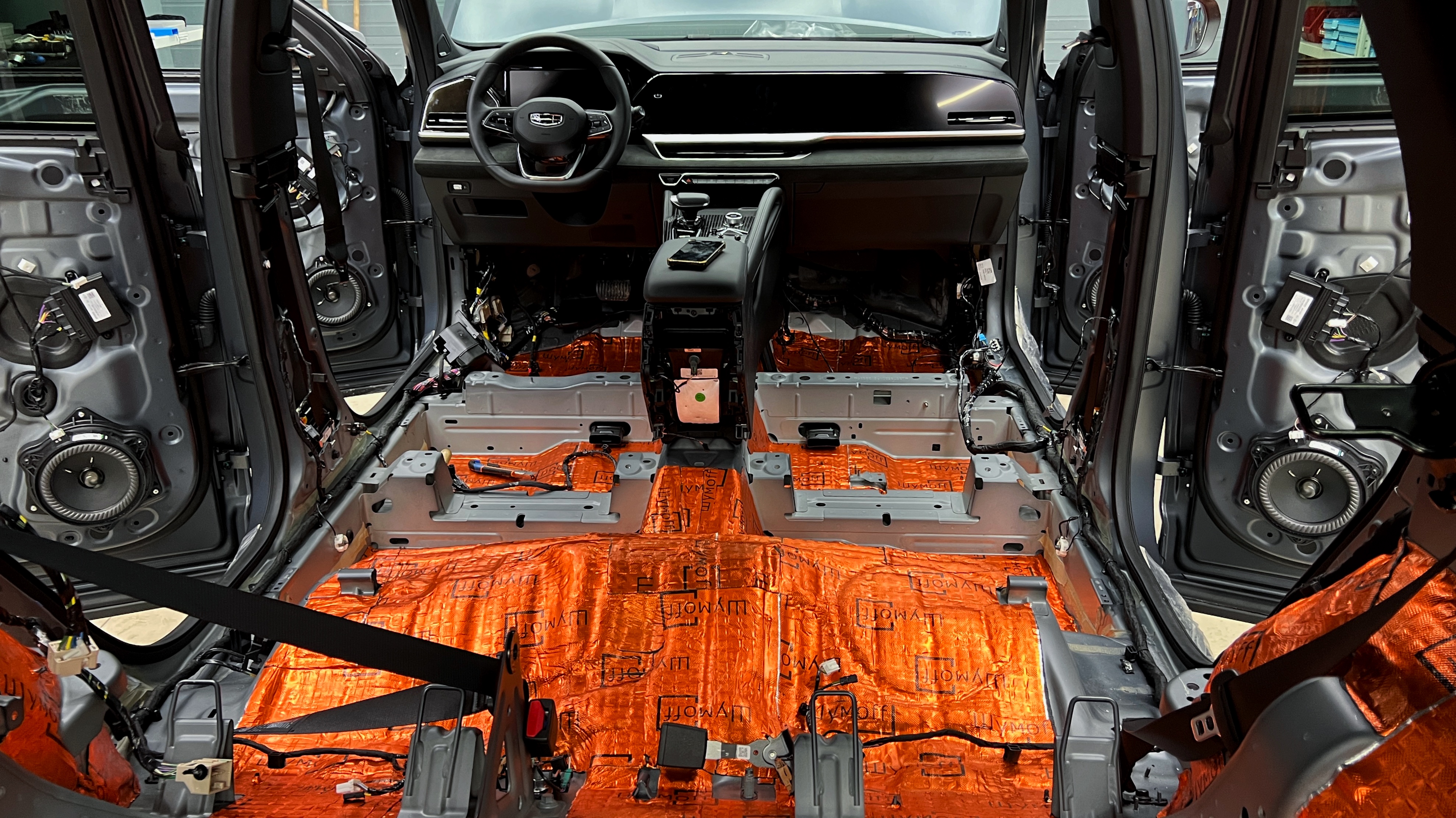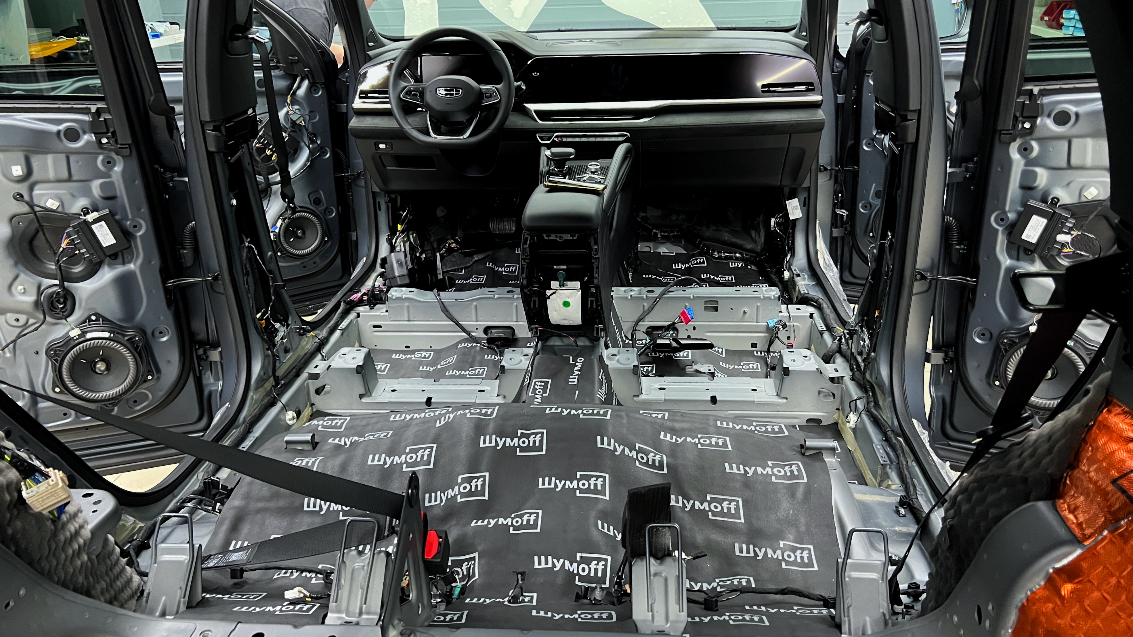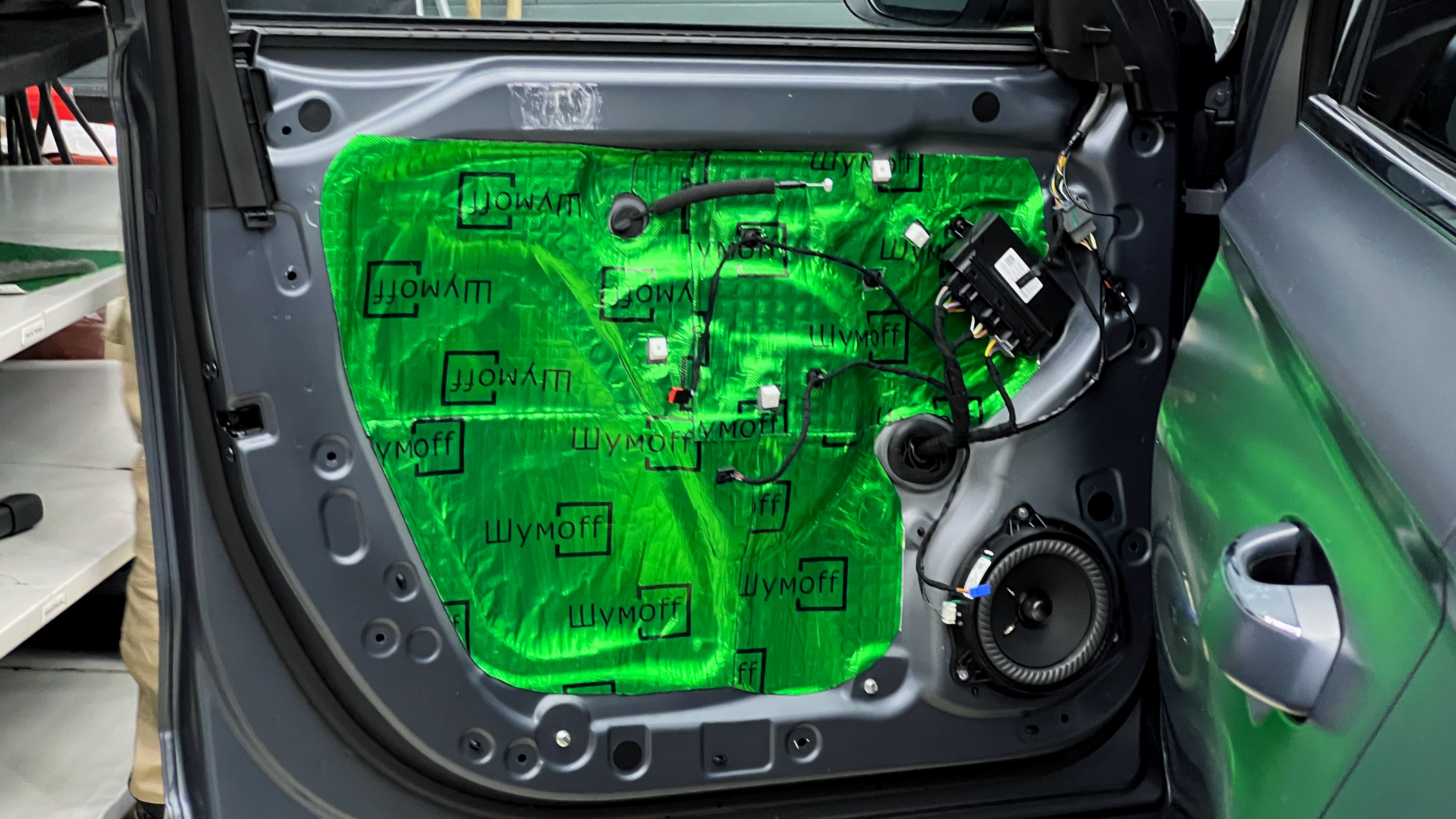 Переходим к оклейке самого корпуса панели, первым слоем частично наносим виброизоляцию Шумофф Joker, создавая тем самым идеальный баланс. Такая частичная оклейка позволит нам чрезмерно не утяжелять панель и придать ей необходимую сбитость