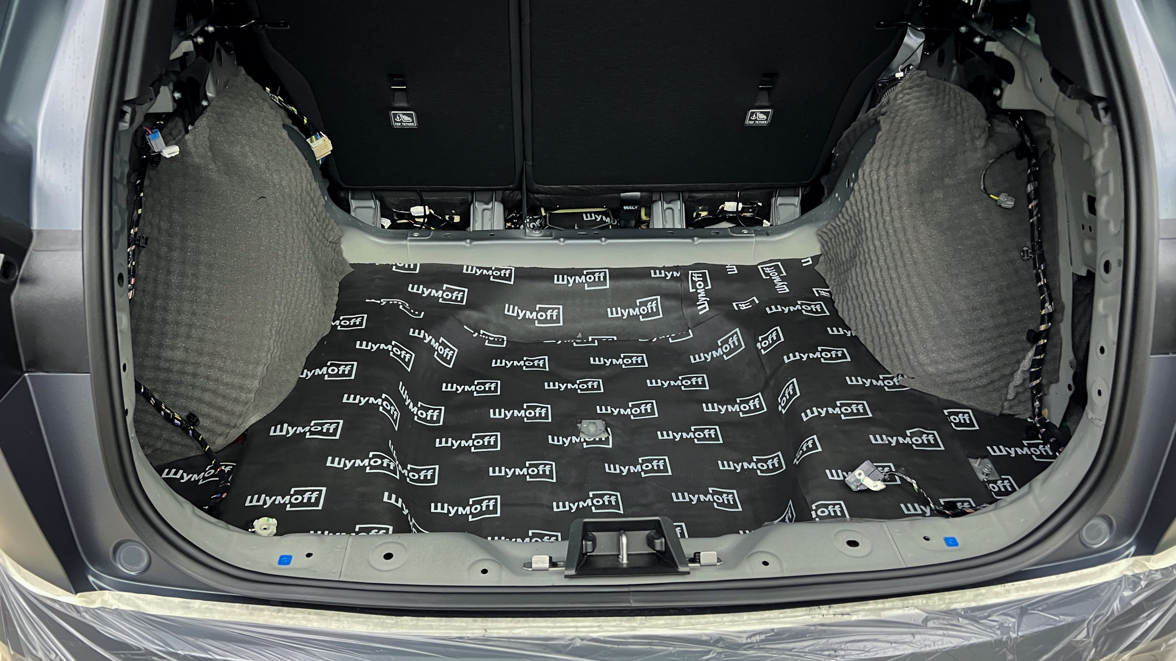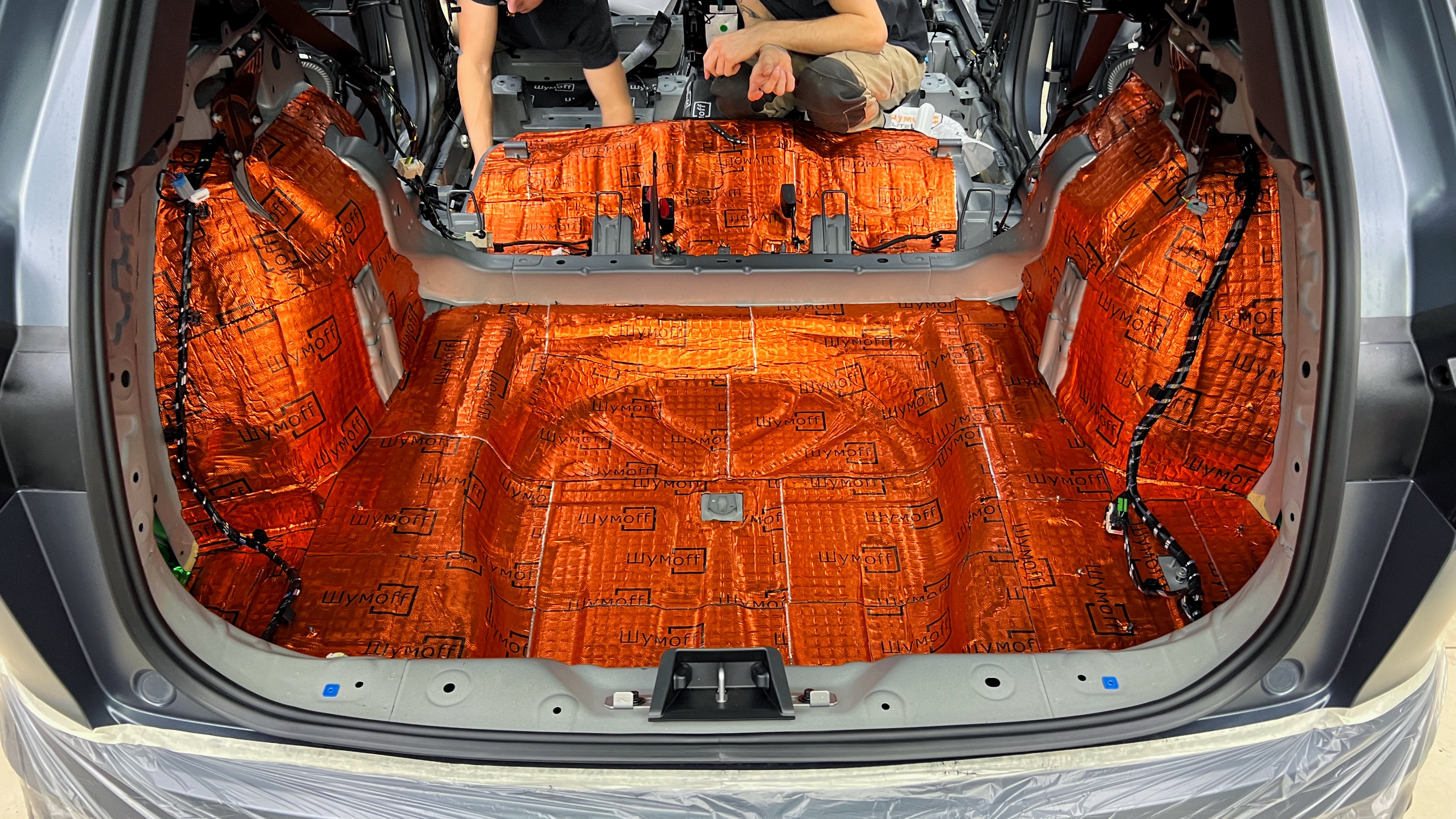 Обезжириваем поверхность и приступаем к монтажу второго слоя. Также для получения более эффективного результата используем компоновку из двух материалов На дно багажника клеим Шумофф Base 4. Этот слой позволит снизить нам шум от дороги.