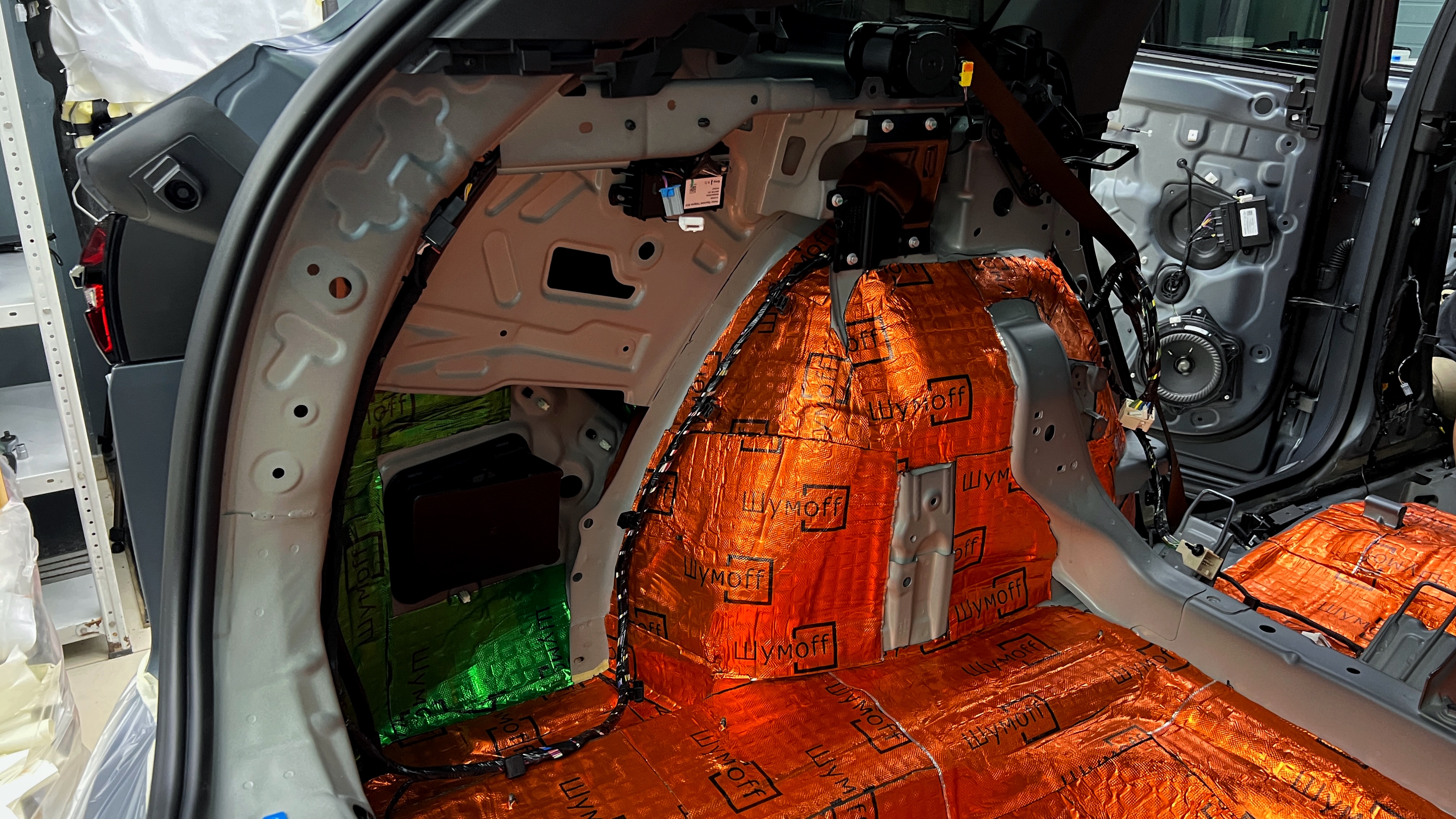 На арки клеим также Шумофф М3, а для крыльев используем менее тяжелый М2. Оклеиваем максимальную площадь багажника за исключением усилителей и ребер жесткости. Данная компоновка материалов позволит идеально достичь нужной эффективности при минимальном увеличении веса, что вместе с виброизоляцией пола также поможет нам снизить вибрацию от дороги, увеличить целостность и сбитость авто.