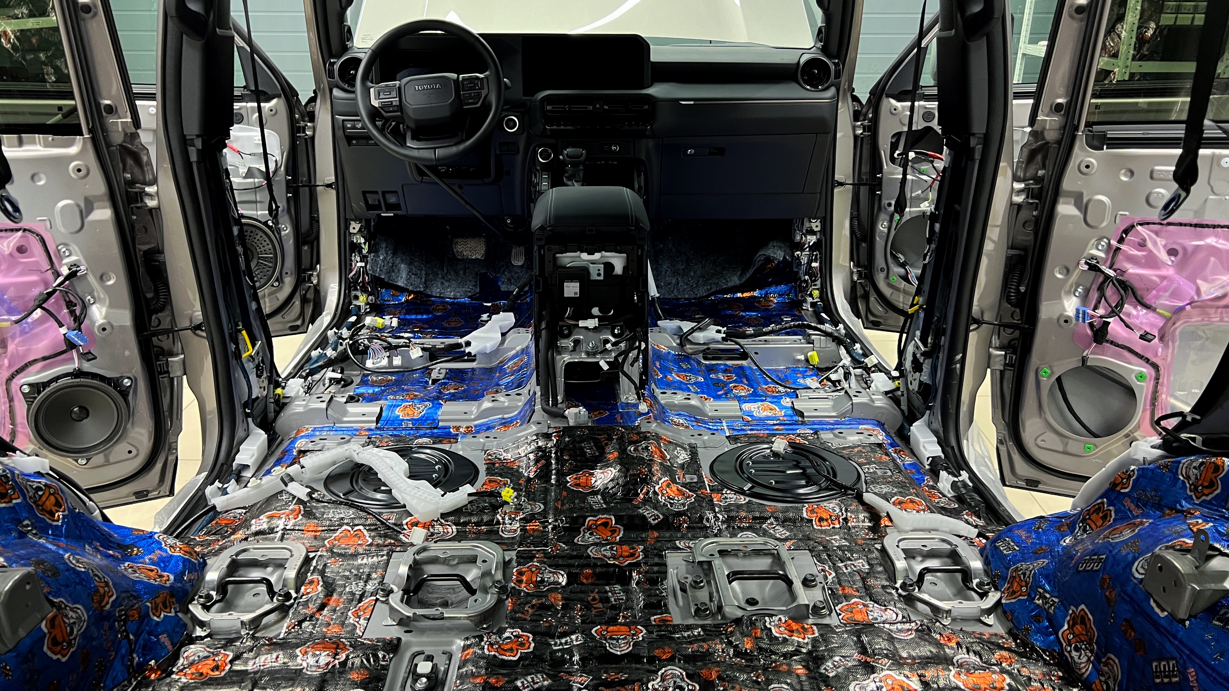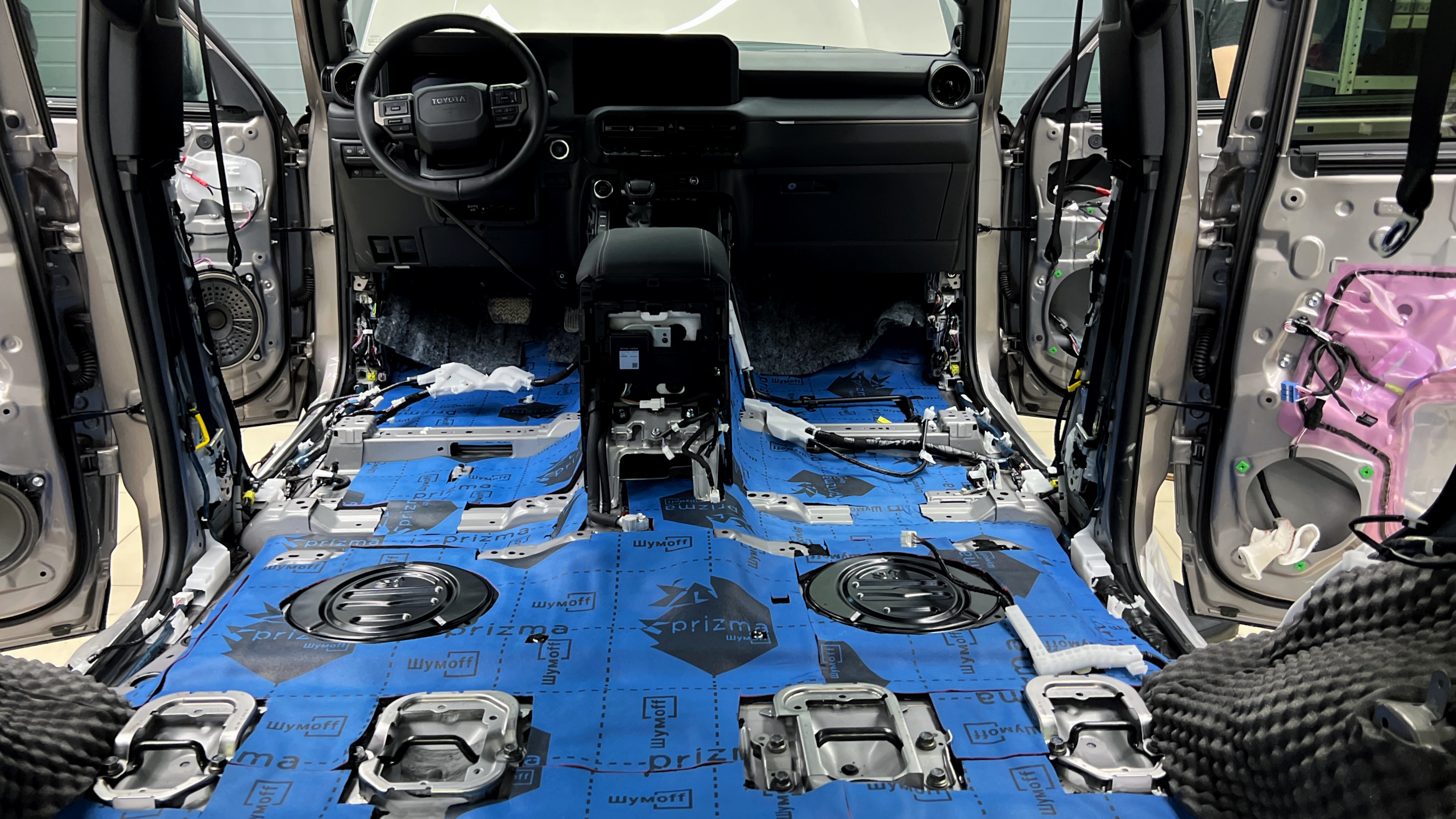 Переходим к оклейке самого корпуса панели, первым слоем частично наносим виброизоляцию Шумофф Joker, создавая тем самым идеальный баланс. Такая частичная оклейка позволит нам чрезмерно не утяжелять панель и придать ей необходимую сбитость