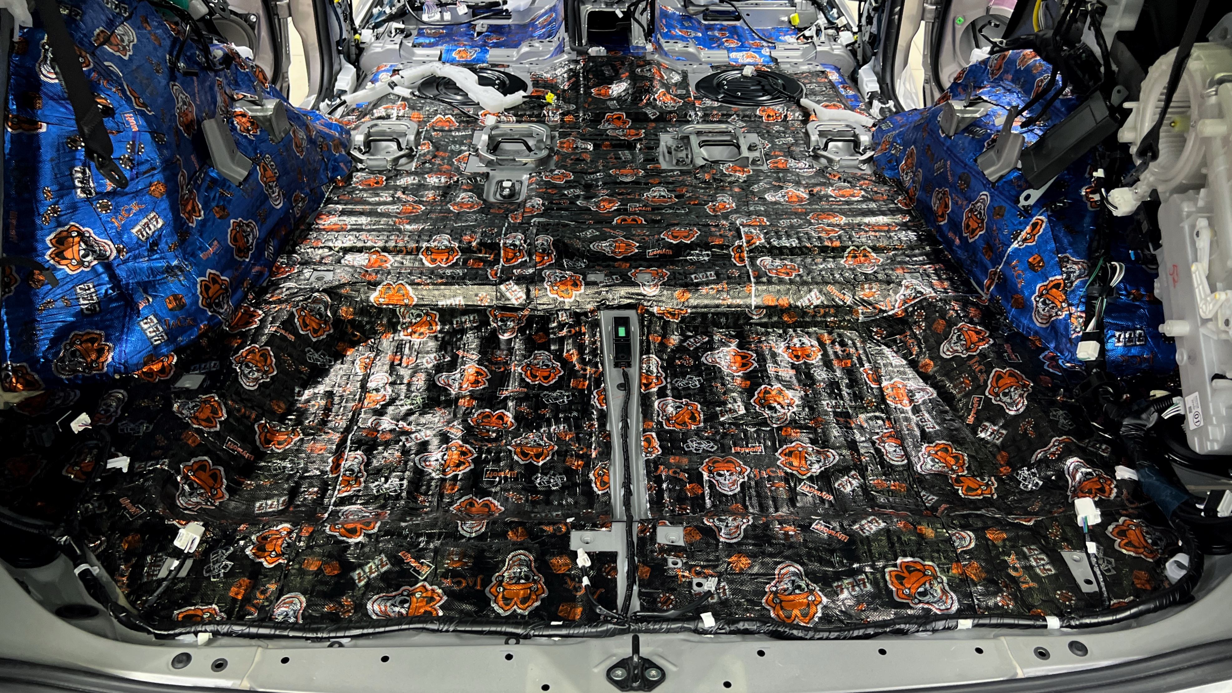 Обезжириваем поверхность и приступаем к монтажу второго слоя. Также для получения более эффективного результата используем компоновку из двух материалов На дно багажника клеим Шумофф Base 4. Этот слой позволит снизить нам шум от дороги.