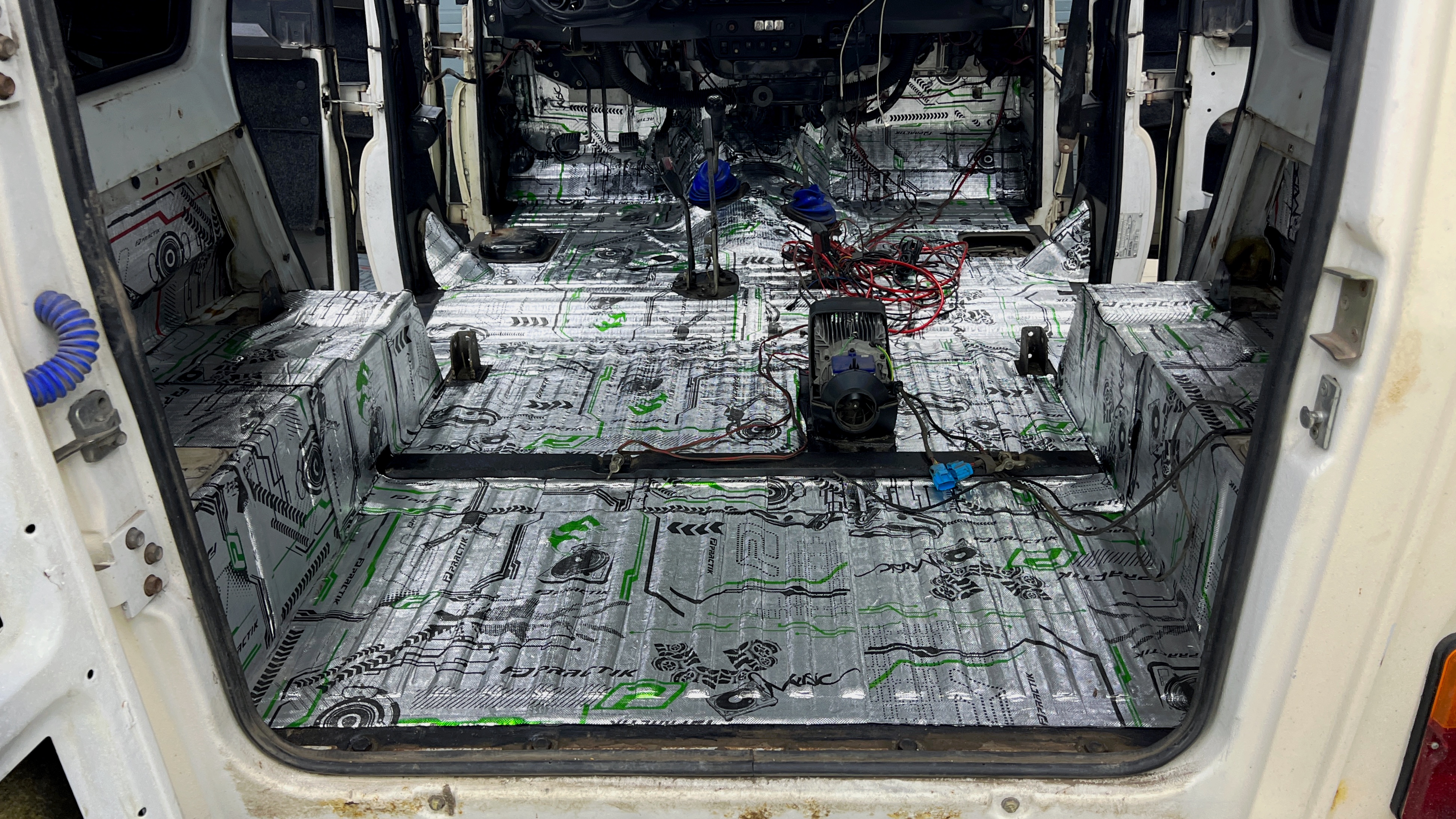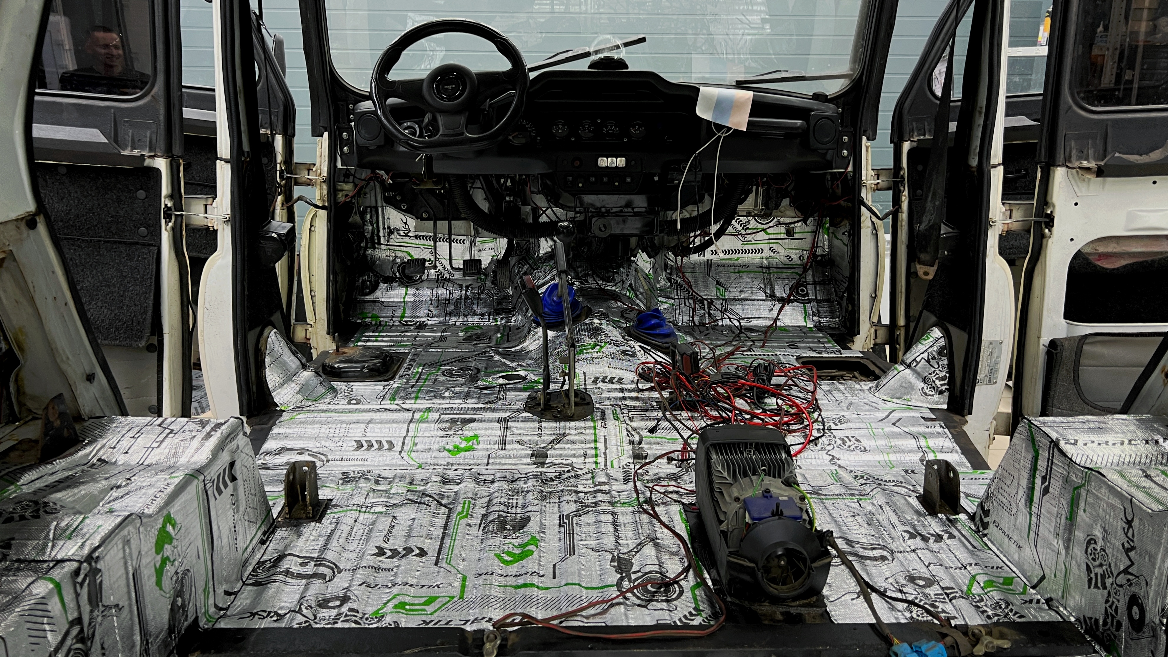 Шумоизоляция пола УАЗ Хантер Снова обезжириваем поверхность пола и приступаем к нанесению второго слоя. Весь пол от моторной перегородки и под задним сиденьем оклеиваем шумо и теплоизолятором Practik Base 4. Второй слой позволит нам снизить шум от колес и дорожного покрытия, а также значительно увеличить теплоизоляцию салона.
