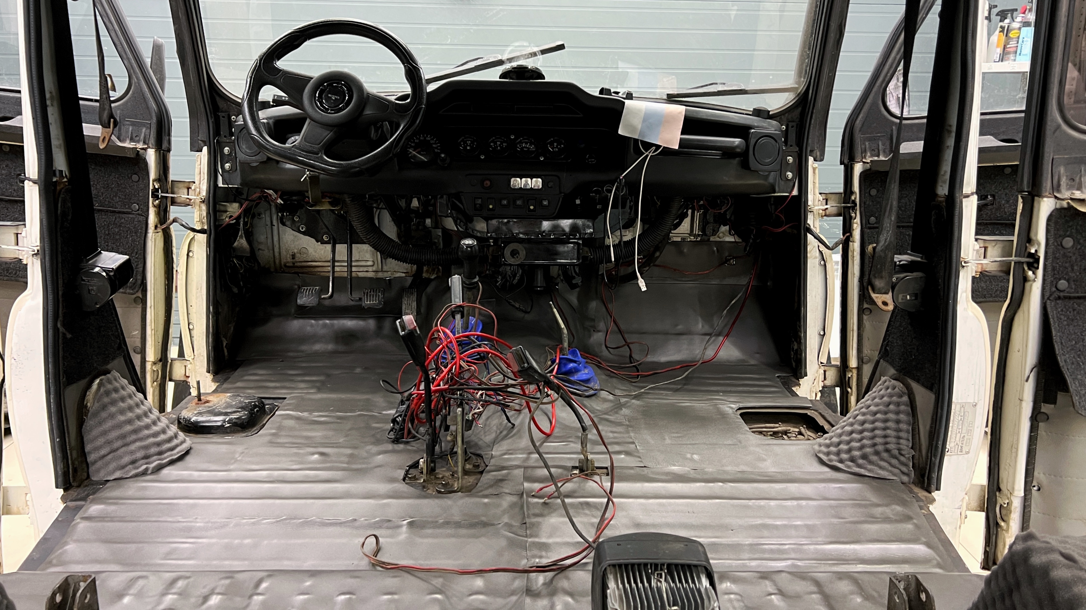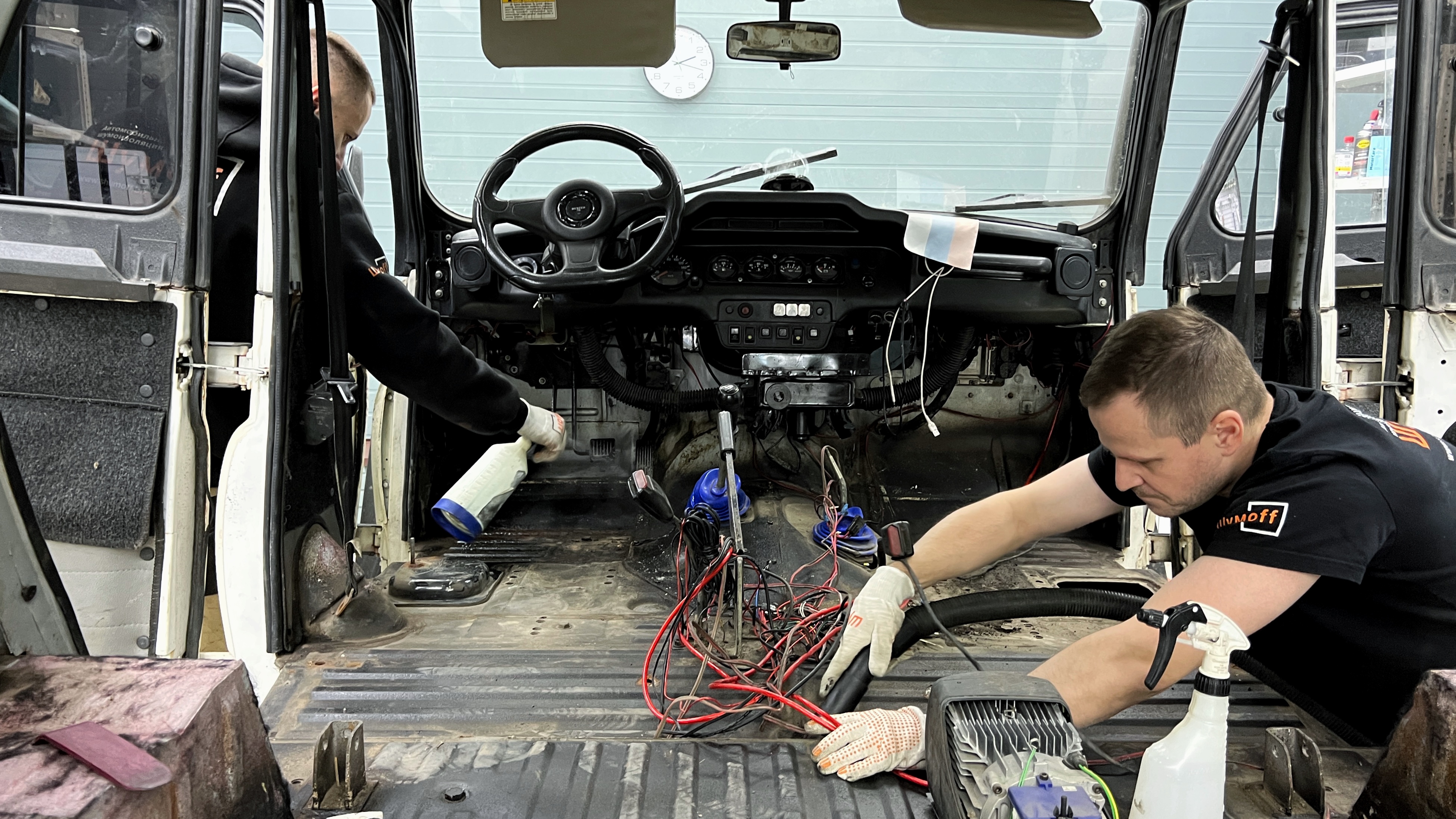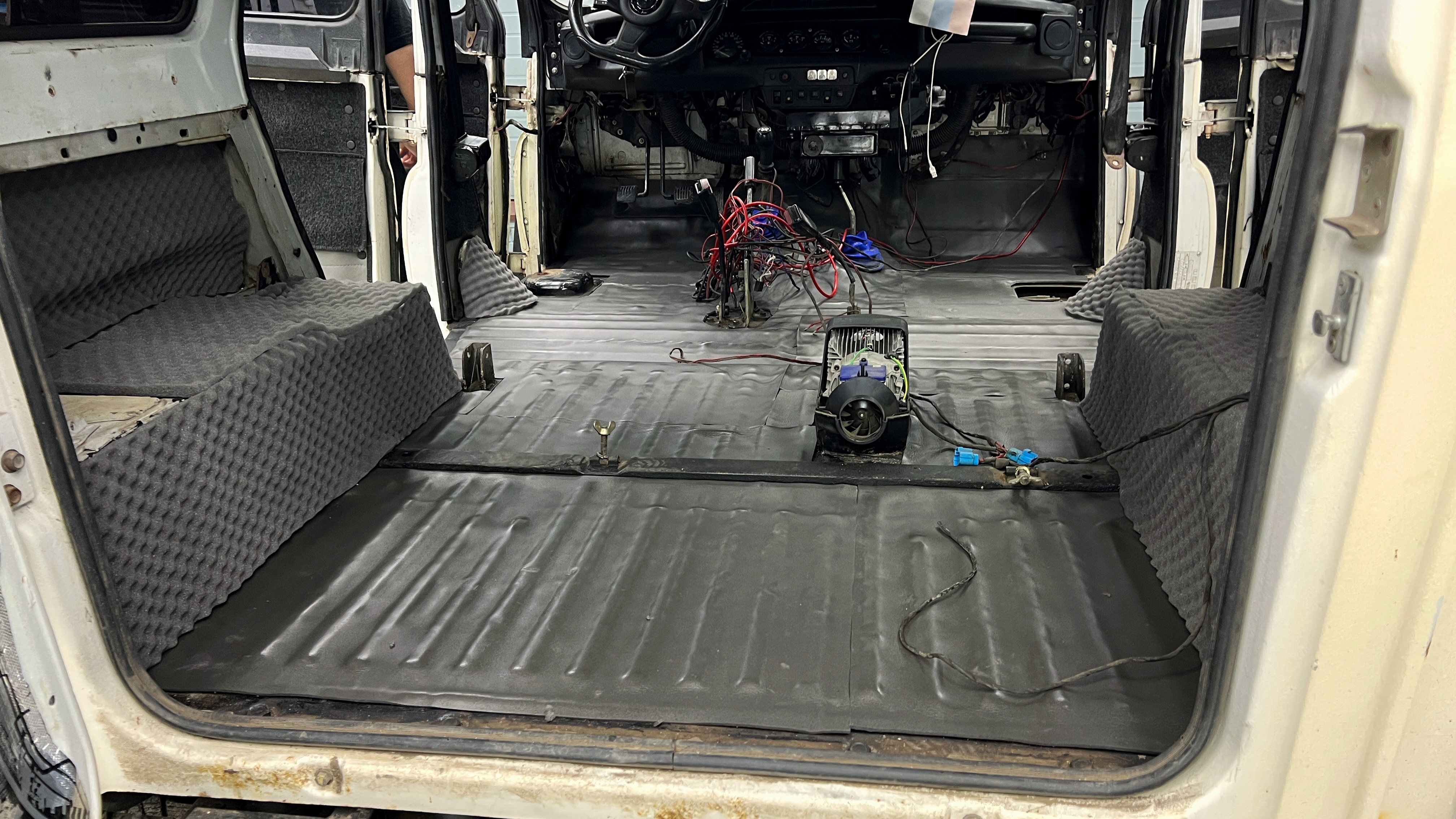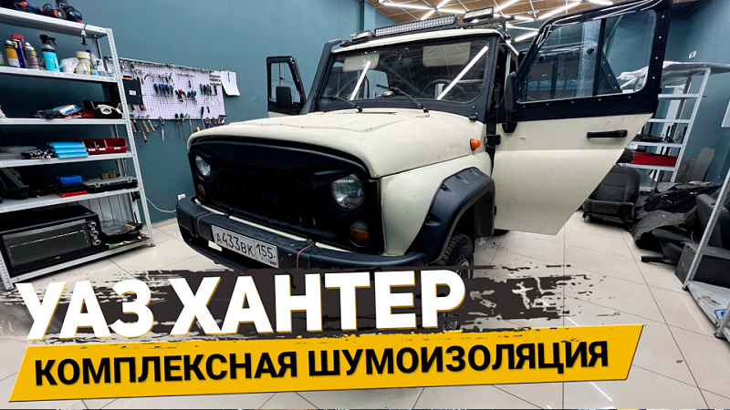 Разбор салона УАЗ Хантер Приступаем к разбору салона: аккуратно вынимаем сиденья, среднюю консоль, обшивки и ковер и складываем все на специальный стеллаж. Перед началом шумоизоляции пола на UAZ Hunter (УАЗ Хантер) необходимо проверить качество адгезии заводской виброизоляции к кузову. Она должна хорошо держаться, в противном, случае её необходимо демонтировать.