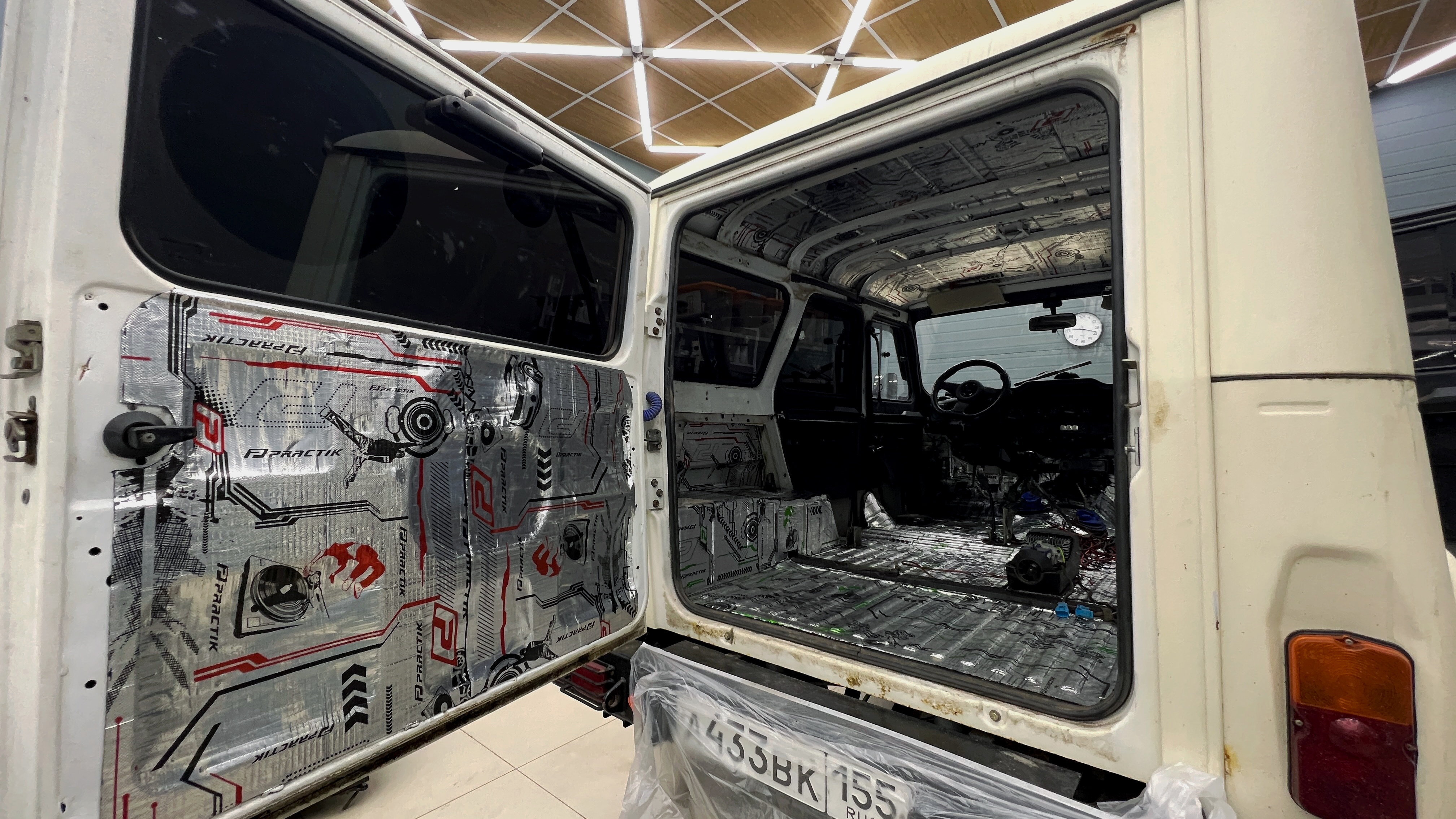 Виброизоляция дверей УАЗ Хантер Аккуратно демонтируем обшивки и складываем их на специальный стеллаж, чтобы не повредить. Очищаем и обезжириваем. Первым слоем внутрь двери клеим виброизоляцию Practik 2,1 и прикатываем к поверхности. Оклеиваем всю возможную внутреннюю поверхность двери, кроме ребер жесткости. Этот слой поможет улучшить звучание даже штатной акустики, а также сделать закрывание дверей более приятным. После чего приступаем к оклейке второго слоя так же виброизоляцией Practik 2,1. Второй слой в совокупности с первым улучшает звучание акустики, а также засчет увеличения массы, двери будут закрываться более четко, тихо и плотно.