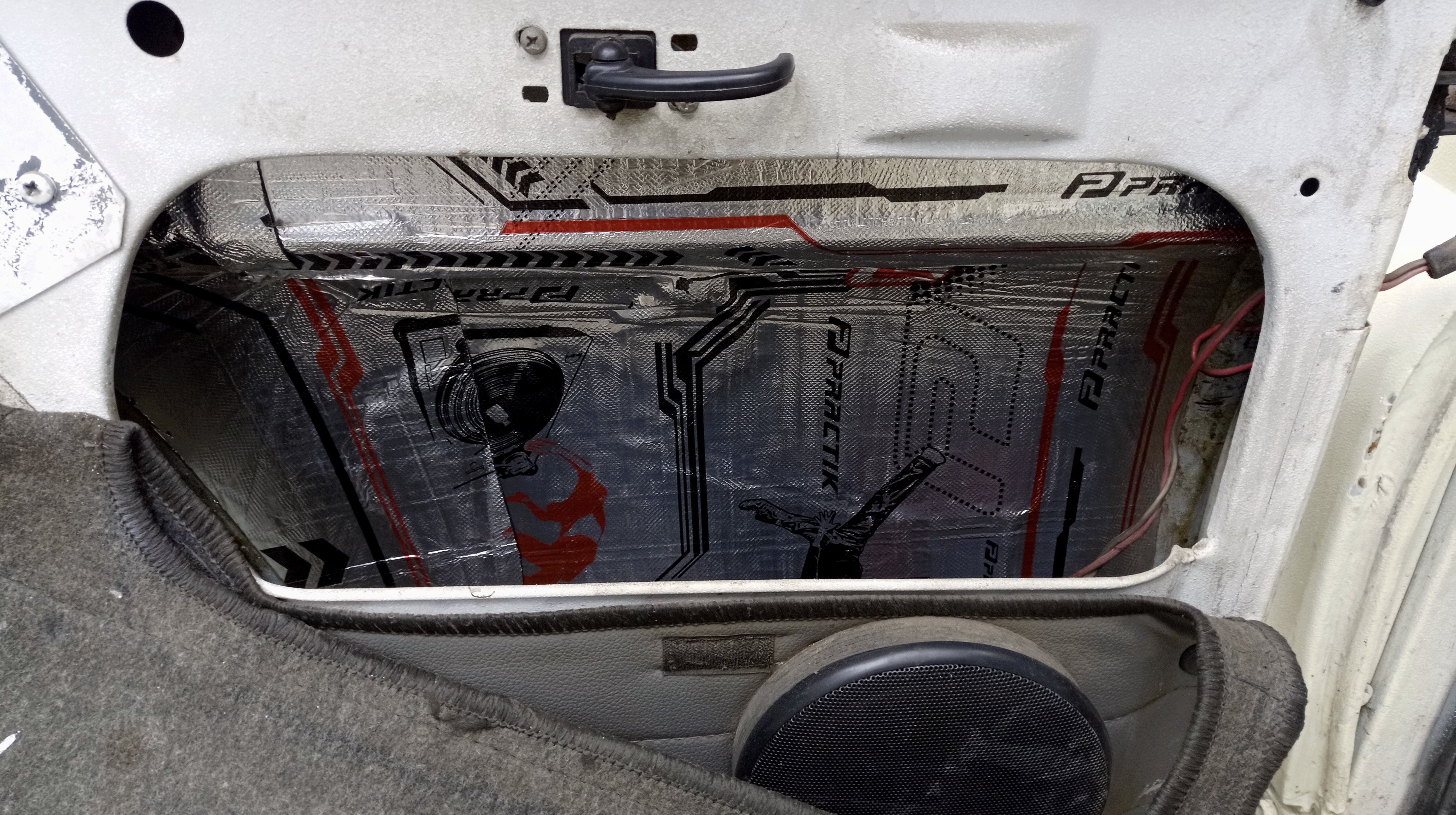 Оклеиваем максимальную площадь кроме ребер жесткости. Данный материал позволит как снизить внешний шум в салоне, так и за счет уменьшения пере отражений звука внутри двери существенно улучшится качество звучания акустики.