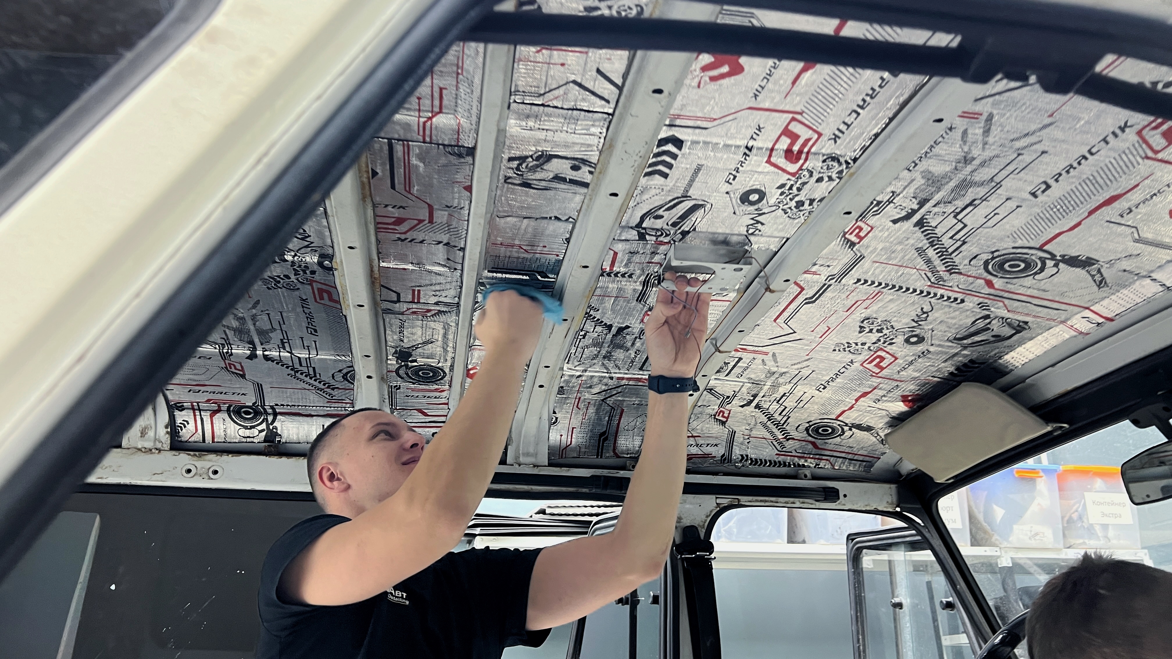 Виброизоляция крыши УАЗ Хантер Обезжириваем всю поверхность крыши и приступаем к монтажу первого слоя. Для первого слоя используем виброизоляцию Practik 3. Клеим между ребер жесткости и тщательно прикатываем её, во избежание попадания в плохо прокатанные участки, влаги или воздуха, что может спровоцировать образование коррозии. Этот слой позволит полностью убрать шум от дождя и града в салоне автомобиля.